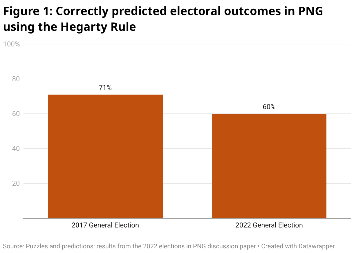 In our recently released discussion paper on the 2022 election in PNG, along with many other topics, we revisited the Hegarty Rule, improving on the regressions we have used in the past. When we did this, we found a clear relationship over time between changes in candidate numbers and whether incumbents won their seats back or not. The relationship isn’t perfect: sometimes candidate numbers shot up and incumbents still won their seats back, but a correlation is there in the data.