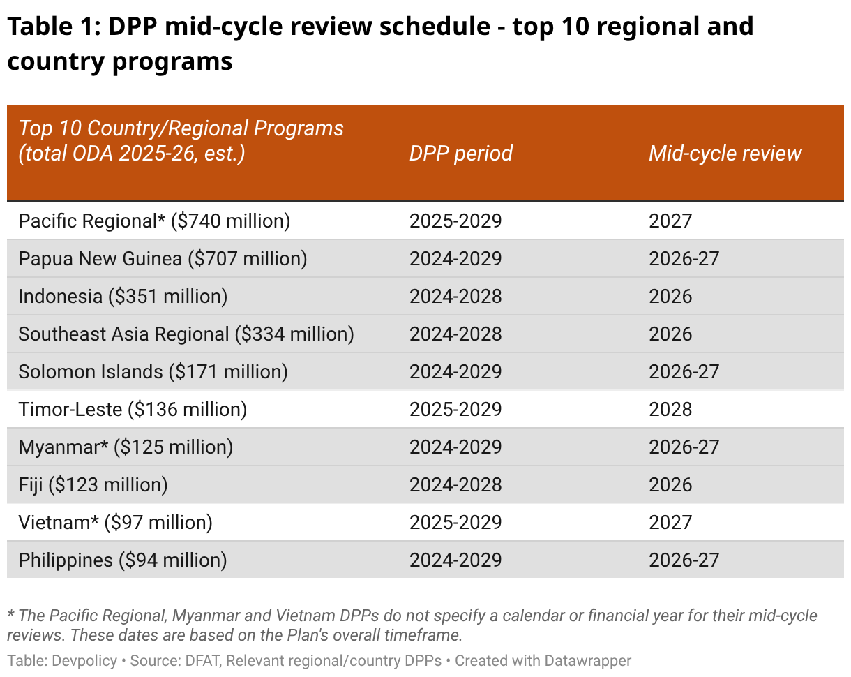 The mid-cycle reviews of the Development Partnership Plans (DPP) for seven of DFAT’s ten largest regional and country programs are scheduled for either this calendar year and/or in the coming financial year (Table 1). According to DFAT, the mid-cycle reviews will “capture, share and apply learning about progress” against the DPPs’ objectives.