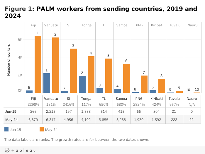 Vanuatu has been the biggest PALM sending country since 2017 when it overtook Tonga. But just in May of this year, Fiji displaced Vanuatu. As the next graph shows, Vanuatu has experienced spurts of rapid growth, but also periods of decline, especially since March 2023. Fiji’s growth, while not monotonic, has been more consistent (Figure 2).