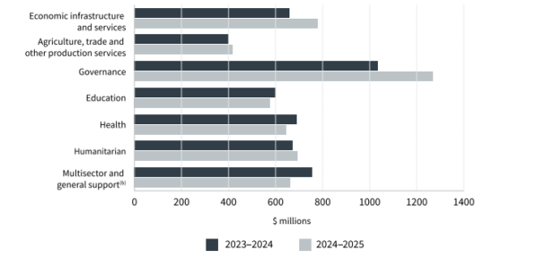 DFAT has released its ODA statistical summary for 2024-25. Sector reporting shows that governance (+22%) and economic infrastructure and services (+19%) saw the biggest year-on-year increases in spending, while health was the individual sector that saw the biggest decrease (-7%) (Figure 2).
