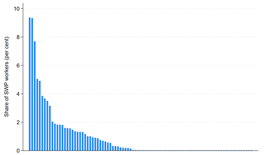 Our analysis is based on Australian tax and visa records, accessed and analysed through the Australian Bureau of Statistics (ABS) DataLab cloud environment. As far as we are aware, our paper is the first to use this exciting new administrative data to estimate the impacts of immigration and the first in the world to measure the wage impacts of seasonal work visas. To construct a reliable measure of domestic worker exposure to the SWP, we use visa records to pinpoint the location and occupation of every SWP worker. Figure 1 plots our SWP exposure intensity indicator: the number of SWP workers in 2018 in each ABS Statistical Areal Level 4 (SA4) region divided by the size of the domestic labourer workforce in that region at baseline (that is, in 2011, before the SWP was announced).