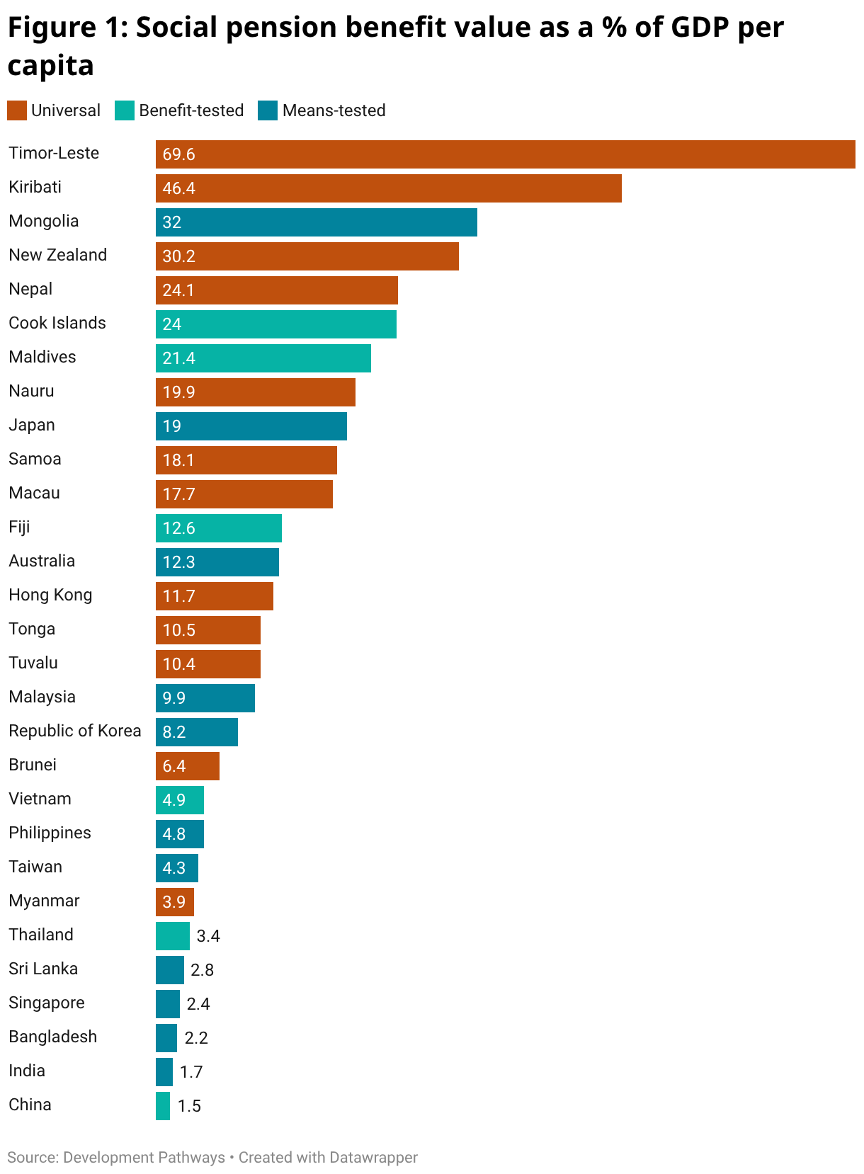 Many countries across the region — including Kiribati, Cook Islands and Nauru — provide social pensions with benefit levels exceeding the recommended benchmark of 15% of GDP per capita, reflecting strong commitments to income security in old age according to Development Pathways’ research on tax-financed pensions in the Asia-Pacific (Figure 1).
