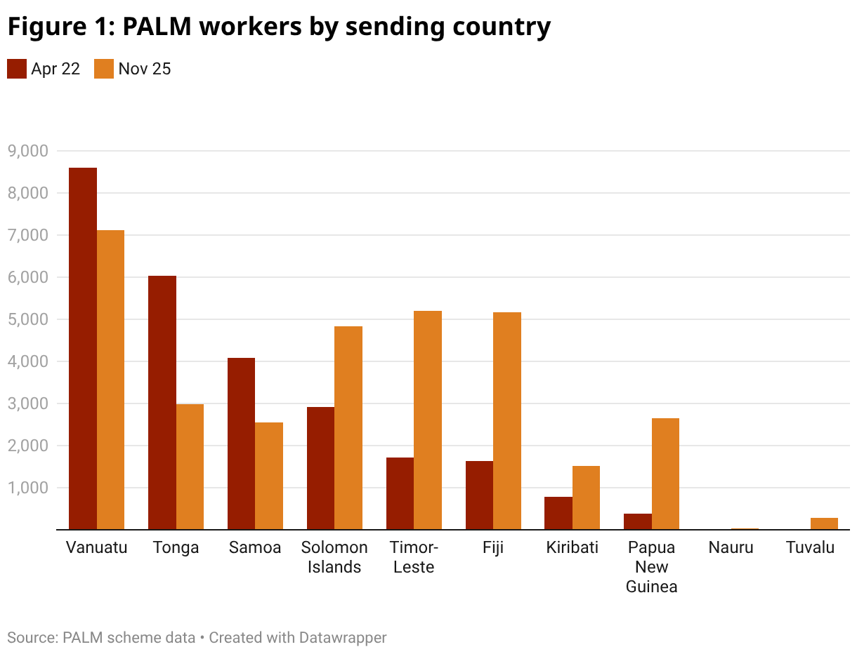 PALM (Pacific Australia Labour Mobility) growth has stalled. The total number of PALM workers in Australia was 26,185 in April 2022, 34,230 in June 2024 and 32,365 in November 2025. But there is still plenty of churn among the ten PALM-sending countries (nine Pacific Island countries plus Timor-Leste) from which employers are sourcing their workers.