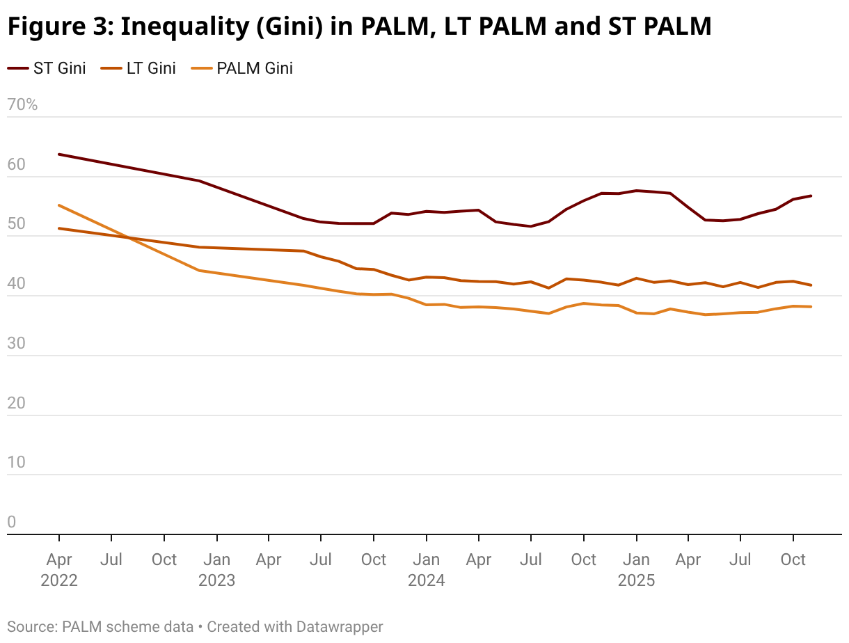 It turns out these two changes are linked. There is less inequality in the distribution of workers across sending countries in the LT component of the PALM scheme. As it has grown more important, this has pushed down the overall inequality.