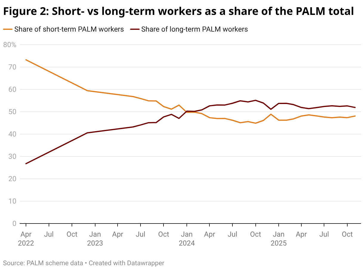 Another big change is in the shares of long-term (LT) and short-term (ST) workers. The latter come for less than a year and mainly work on farms. The former come for up to four years and work mainly in abattoirs. The share of long-term workers in total PALM workers has increased from 27% in April 2022 to 53% in June 2024 and has been roughly unchanged since.