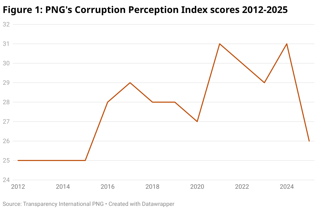 The higher the CPI score out of 100 the less corrupt a country is perceived to be. Conversely, the lower the score, the higher the perception of corruption. PNG’s score of 26/100 in the 2025 CPI shows a five-point drop from the last assessment — with PNG attaining its lowest score in a decade.