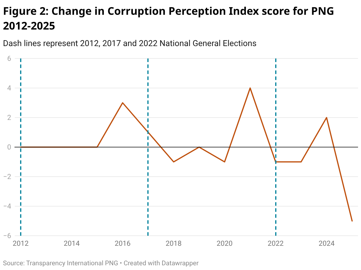 The periods of stagnation align with the years following the formation of a parliament after an election. Then there are improvements in CPI scores at the end of a term of parliament, followed by stark declines in election years. This trend has held for the last three electoral cycles in PNG. This makes the five-point drop in PNG’s 2025 CPI score even more alarming as it is ahead of schedule — the next election is scheduled for mid-2027. Assuming the pattern observed by TIPNG holds and intensifies, it is highly likely that the political climate will only worsen perceived corruption in the lead-up to the election unless strategic action is taken now.