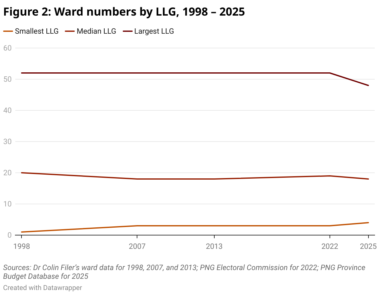 For the provinces conducting elections, ward and LLG numbers have grown quicker since 2022 than in previous periods. Provinces have cited high population growthhigh population growth, the need for improved access to government services and better managementbetter management of funds as reasons for proposing new wards and LLGs. It is unlikely, however, that the new wards and LLGs were informed by the 2022 electoral roll or the 2024 census. And the new LLGs have done little to reduce variation in ward distribution. This year’s elections are expected to be conducted in 6,916 wards across 374 LLGs. (See the PNG Province Budget Database for a complete list.)