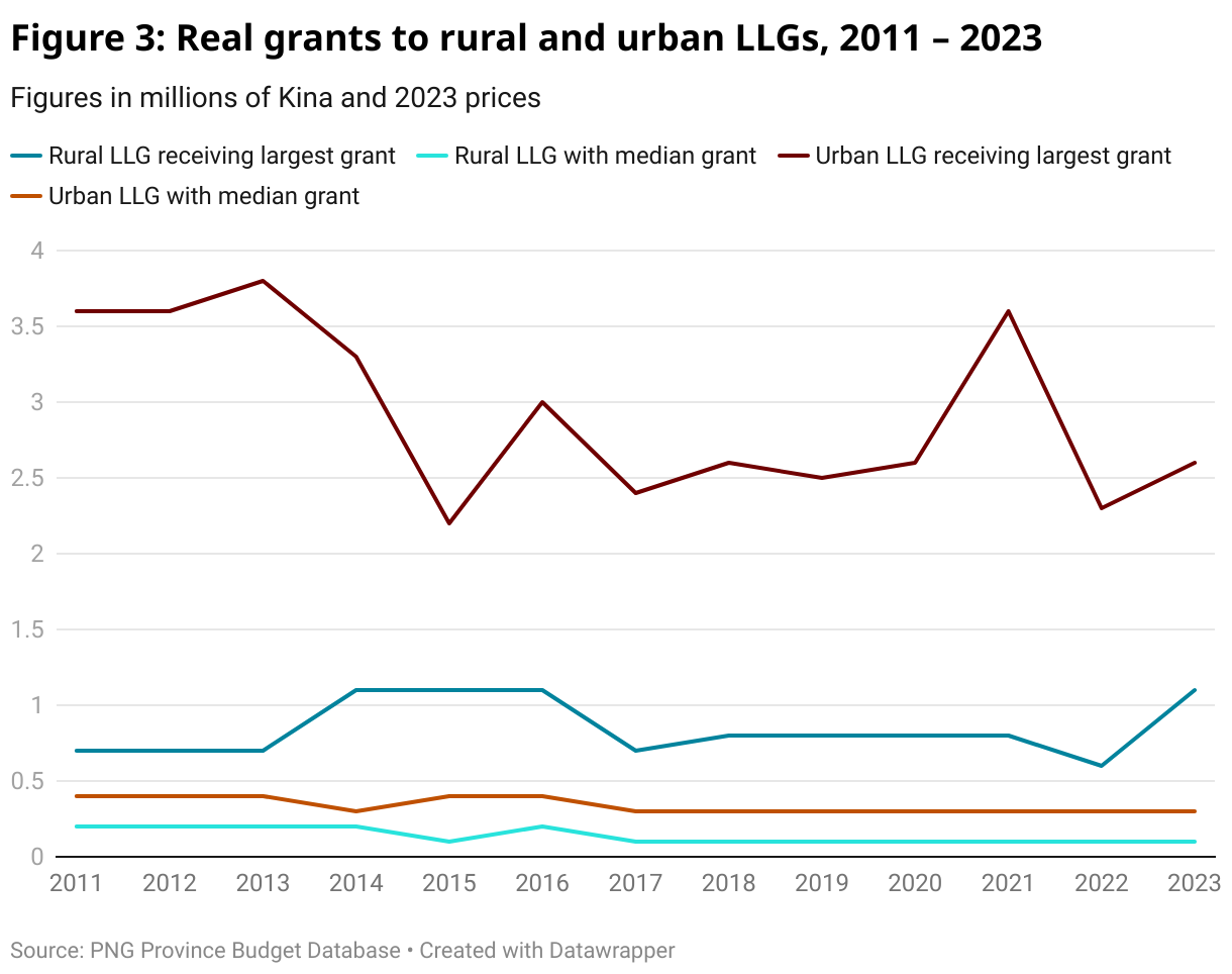 It is entirely possible that urban LLGs face higher costs compared to rural LLGs. Considering population alone, grant sizes are not commensurate with LLG size. According to the 2022 electoral roll (notwithstanding its problems), the urban LLG median of 7,117 was much lower than the rural LLG median of 12,898 voters. Given rapid population growth over time, the 2008 grant determination has largely become ineffective in meeting the development needs of rural PNG and needs to be reviewed.