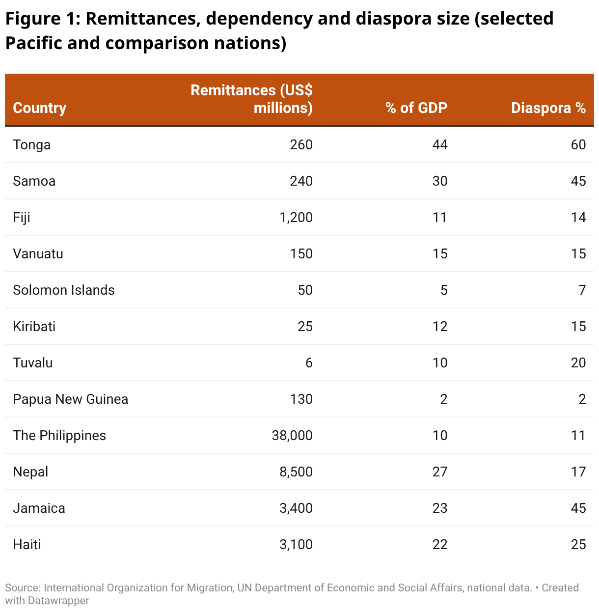 What is the definition of diaspora here? If it’s the number of citizens who reside abroad, 15% for Vanuatu seems very unlikely. Even if you count non-Melanesians who have been naturalized, and even if you count those that may be doing seasonal work abroad at any given time (around 2% of the population I believe).