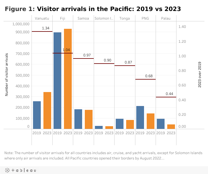 Comparing visitor arrivals in 2023 with those in 2019 (Figure 1 below), it looks like Vanuatu is the biggest winner, but this is misleading. Vanuatu has experienced a surge in cruise tourism, with the number of cruise arrivals nearly doubling from 2019 to 2023 and reaching more than three times the number of air arrivals in 2023. However, cruise tourism in Vanuatu has been “fickle and volatile”. It can strain limited labour resources and generates much less revenue than tourism by air. In 2019, though there were 40% more cruise tourists than air tourists, air tourists generated roughly nine times as much revenue. Meanwhile, Vanuatu’s air tourism arrivals have only recovered to 70% of their pre-COVID levels, with total air arrivals in 2023 at just 64% of 2019 levels.