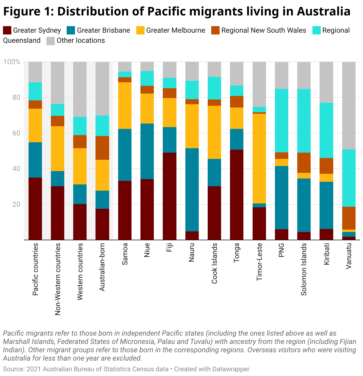 Additionally, migrants from Papua New Guinea, Solomon Islands, Kiribati and Nauru show high concentrations in Queensland, with 71%, 66%, 58%, and 57% of these groups respectively settling in this state. While most Nauruans live in Greater Brisbane (47%), Papua New Guineans, Solomon Islanders and i-Kiribati are more or less evenly split between Greater Brisbane and regional Queensland, with 36%, 36% and 31% residing in the regional areas, respectively.
